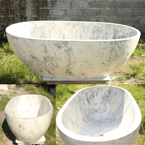 Bathtub ini diproduksi dari terrazzo premium, yaitu bahan komposit berkualitas tinggi yang dibuat dari campuran serpihan marmer alami, granite, quartz, dan terkadang kaca daur ulang, yang semuanya dicampur dengan pigmen pewarna alami serta semen putih berkualitas tinggi sebagai pengikat (cementitious binder). Proses produksi melalui tahapan pemadatan, pengeringan, pengamplasan, dan pemolesan hingga menghasilkan permukaan yang halus, kuat, anti air, dan tahan lama. Terrazzo tidak hanya menawarkan ketahanan luar biasa terhadap suhu dan kelembapan, tetapi juga memberikan tampilan artistik yang unik dan elegan.